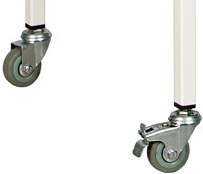 - Манипуляционный стол оснащён четырьмя колёсами диаметром 5 см. На два из них установлен стопор для фиксирования стола в неподвижном состоянии.